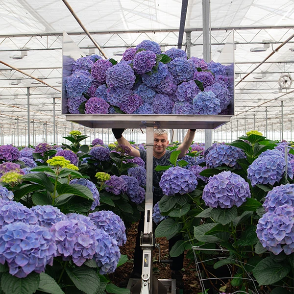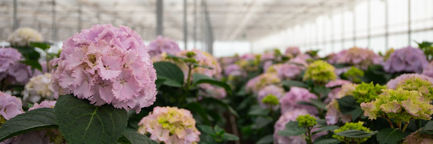 Vicini grows across two greenhouses. One greenhouse produces hydrangeas from April through June, the other from May through December. Thanks to this smart planning and a little help from nature, Vicini offers beautiful hydrangeas for most of the year. And yes, even though they produce in greenhouses, the weather still plays a role. Sunny days speed up growth, while grey days slow things down.